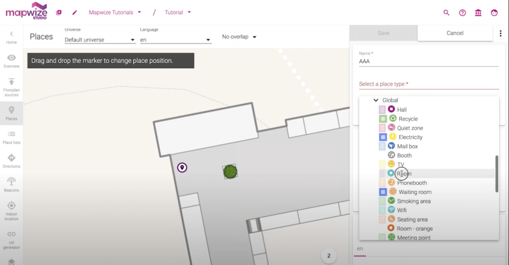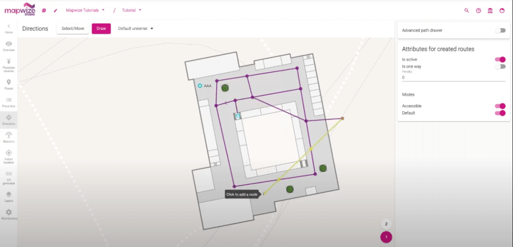 - The Mapwize application intuitively separates workflows for adding locations to a floor plan and for adding directions to those locations: